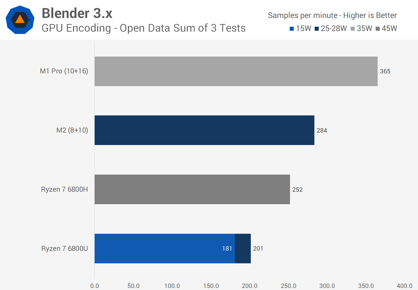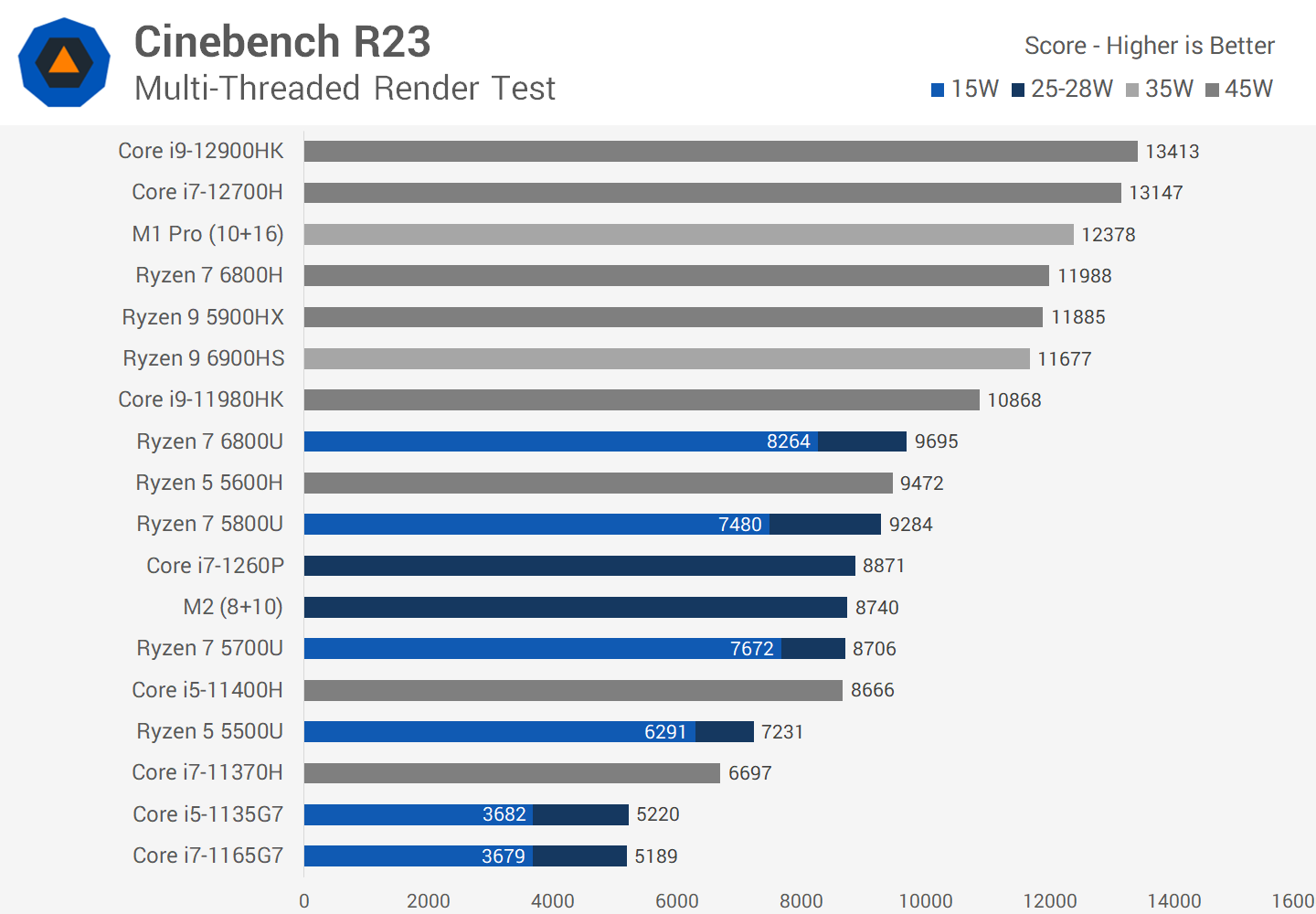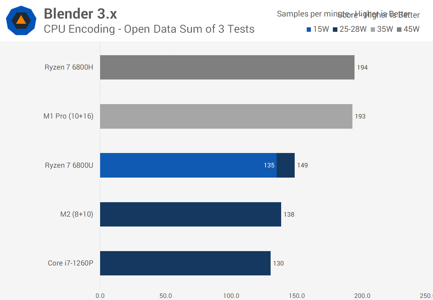 The M2 shows similar results to what we saw in Cinebench, noting that both are native Apple Silicon apps now. The M2 sits closer to the 15W version of the 6800U than the 25W version, but nevertheless outperforms the 1260P.