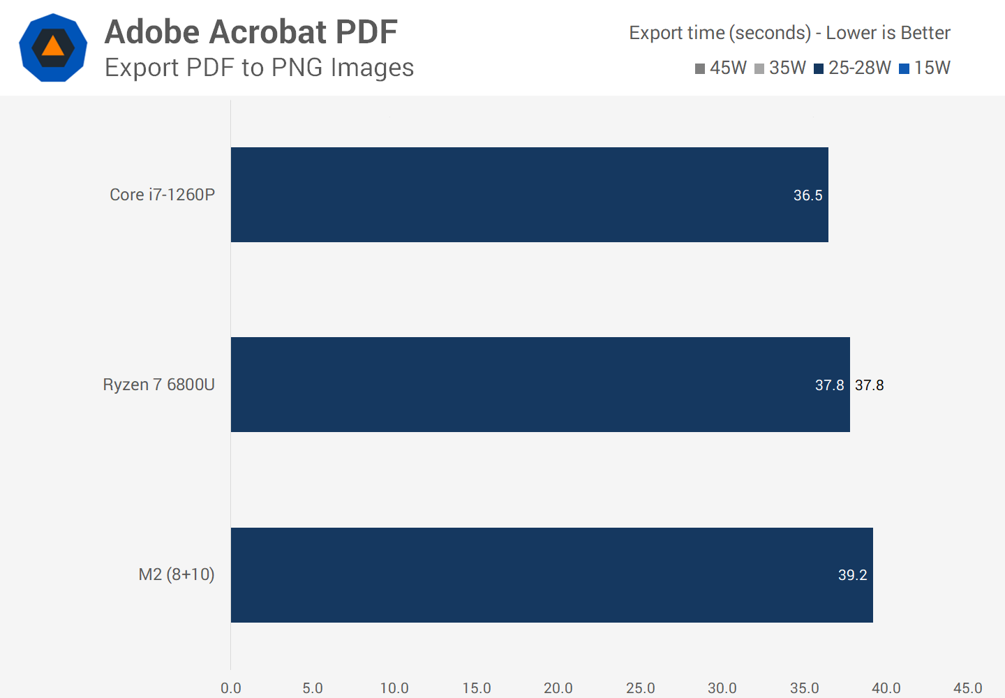 Since we last tested Acrobat PDF exporting, Adobe has updated the app with native Apple Silicon support and performance improvements on all platforms. This makes the same PDF to PNG export run a lot faster now, which warrants a re-test. In this workload, the M2 is pretty close to other competing CPUs in what is still a lightly threaded task. However the 1260P is 7 percent faster and in the leading position, while the 6800U is 4 percent faster. Not earth shattering margins so like I said, close between these parts.