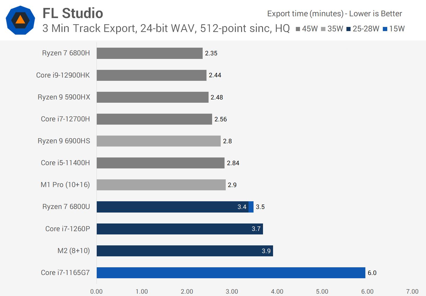 In FL Studio it’s relatively close between the M2 and other mobile processors, although the M2 is the slowest part of the latest-gen CPUs that we’ve tested. The Ryzen 7 6800U is 16 percent faster in this workload when configured at 25W, and 12 percent faster at 15W, while the 1260P is 6 percent ahead.