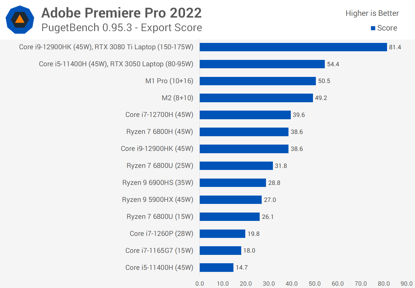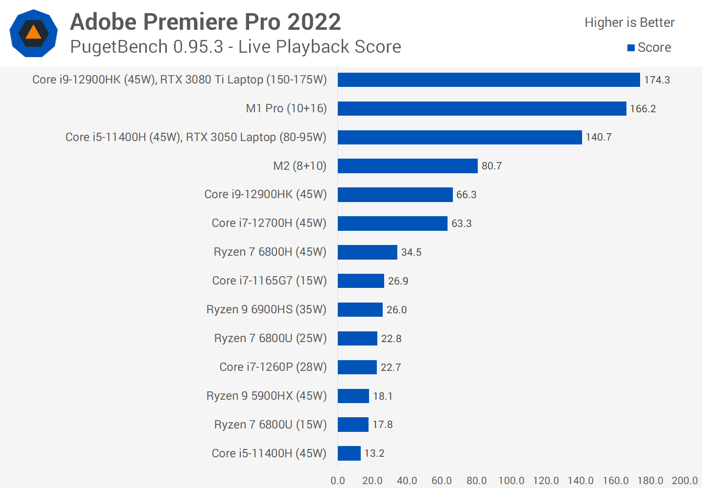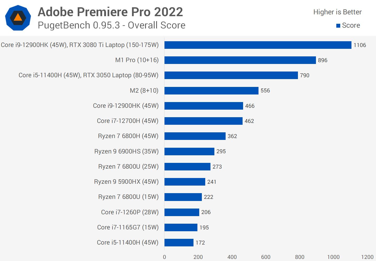 Among integrated graphics solutions, the M2 is a beast for Adobe Premiere and this is really where the accelerators that Apple are using show their strength and power. In the overall score, the M2 crushes low power models like the Ryzen 7 6800U and Core i7-1260P, even outperforming 45W CPUs like the Core i9-12900HK.