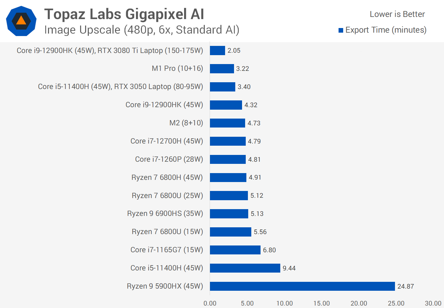 The M2 also performs strongly in Gigapixel AI image upscaling, though not as well as the M1 Pro or laptops that use discrete Nvidia graphics, as you can see from the chart. As far as integrated GPU solutions go, the M2 outstrips the 1260P by a slim margin, both CPUs include hardware accelerated AI processing. The 6800U at 25W, which does not include AI acceleration, falls behind at 8 percent slower, which isn’t a terrible result as the GPU is still a good fallback.