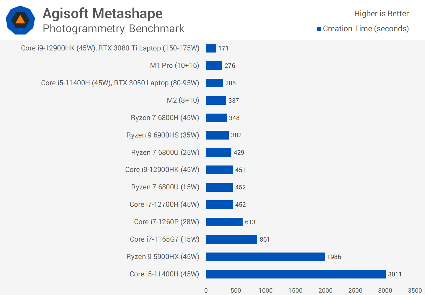 Our final productivity workload is Agisoft Metashape, a photogrammetry benchmark which is mostly run on the GPU. Here the M2 again flexes its muscles, completing the task 27 percent faster than the Ryzen 7 6800U at 25W. That’s not as much of a margin as in the Blender GPU accelerated benchmark, but still a substantial difference given both products are running at roughly the same level of power consumption for GPU accelerated tasks.