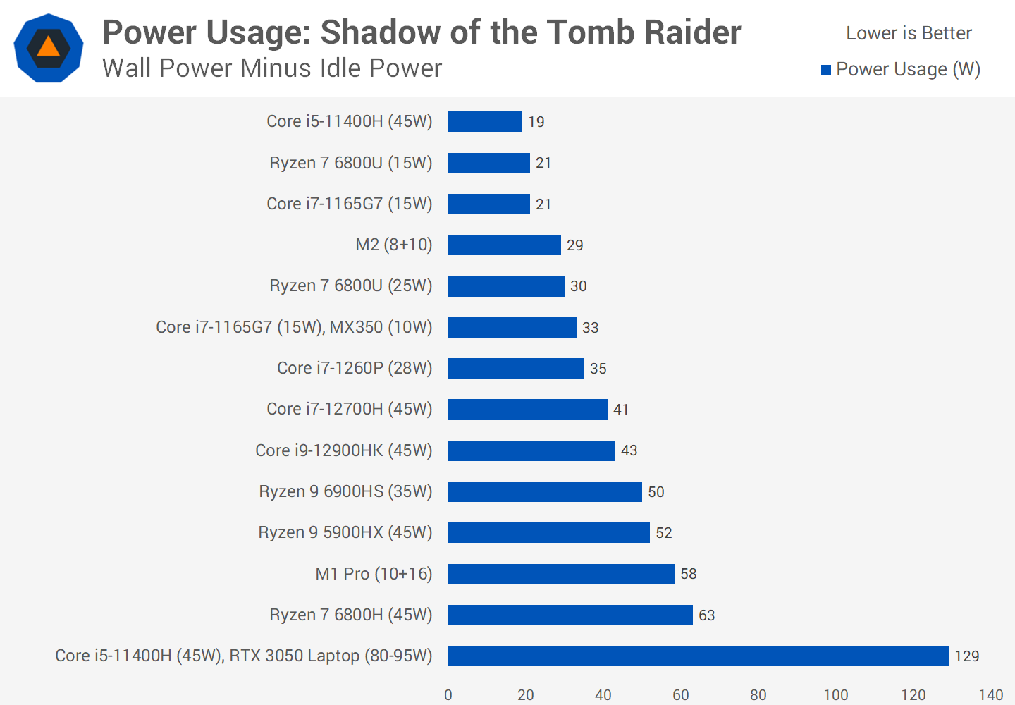 When gaming in Shadow of the Tomb Raider and hitting both the CPU and GPU, the M2 consumes somewhat more power than when we’re just utilizing the CPU heavily.