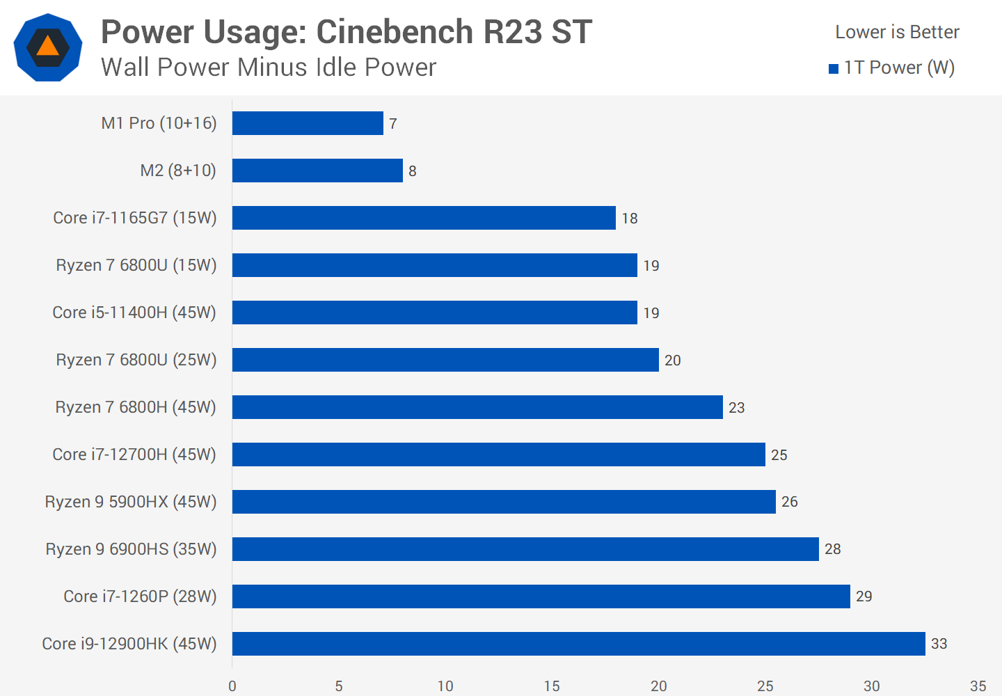 The M2 is extremely impressive in how little power it uses for single-thread applications, just like the M1 Pro was. While the M2 is slightly more power hungry than before due to a small increase in frequency, it’s still using far less power than the next best configuration.
