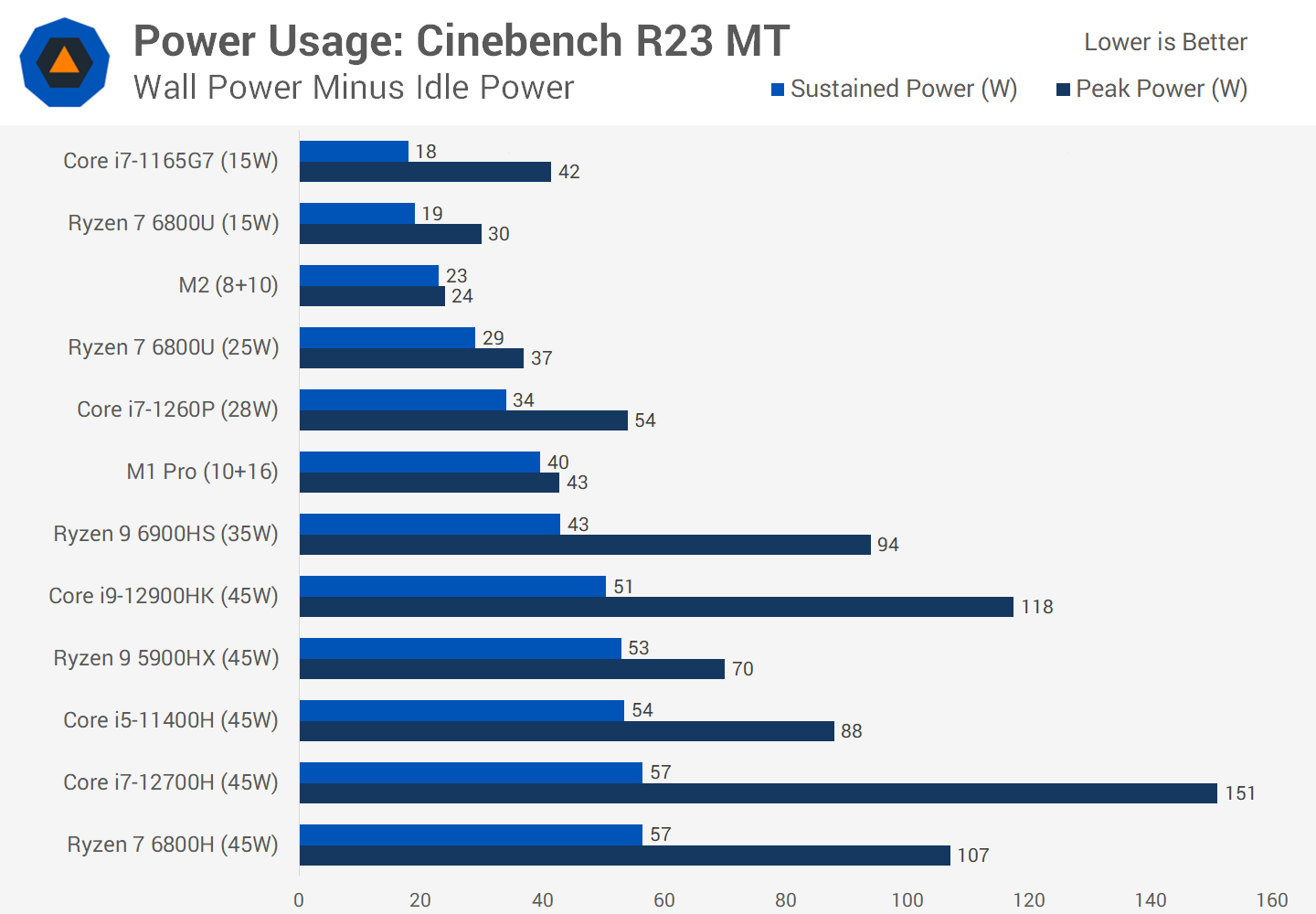 In Cinebench R23 multithreaded we recorded 23 watts of power draw from the wall after subtracting the idle power usage of the system. This puts the general CPU package power between the two configurations of the Ryzen 7 6800U that we’ve tested, at 15W and 25W. What this suggests to us is the M2 is most equivalent to a 20W configuration when the CPU is heavily utilized, which is a typical number for an ultraportable 13-inch notebook.