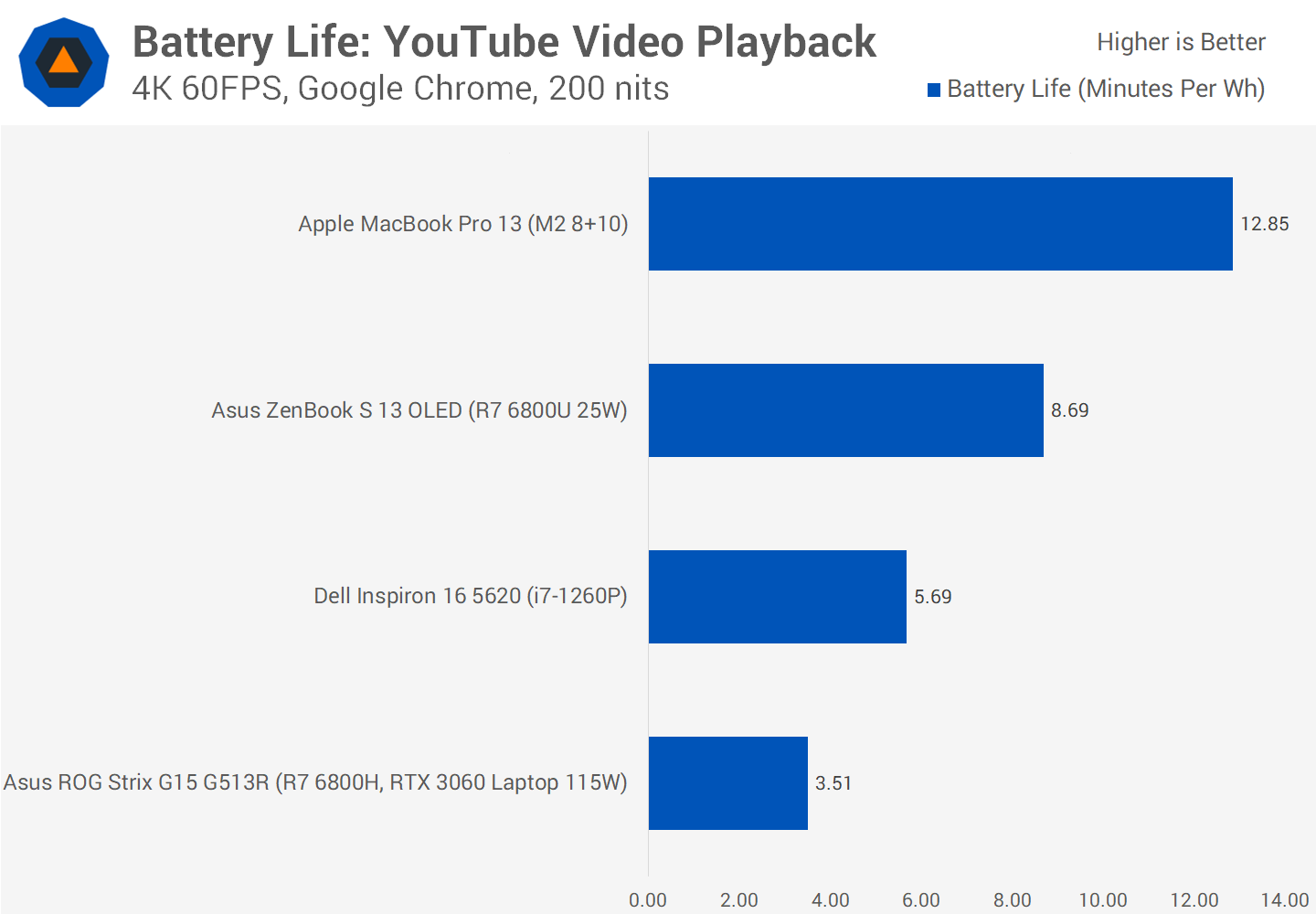 Battery life is the one of the most impressive aspects to the MacBook Pro 13’s performance. In a YouTube 4K playback test in Google Chrome, the M2 powered system lasted over 40% longer per watt/hr than the next best system that used the Ryzen 6800U. We’re using per watt/hr metrics here to normalize for battery capacity, so that larger batteries are not significantly influencing the results.