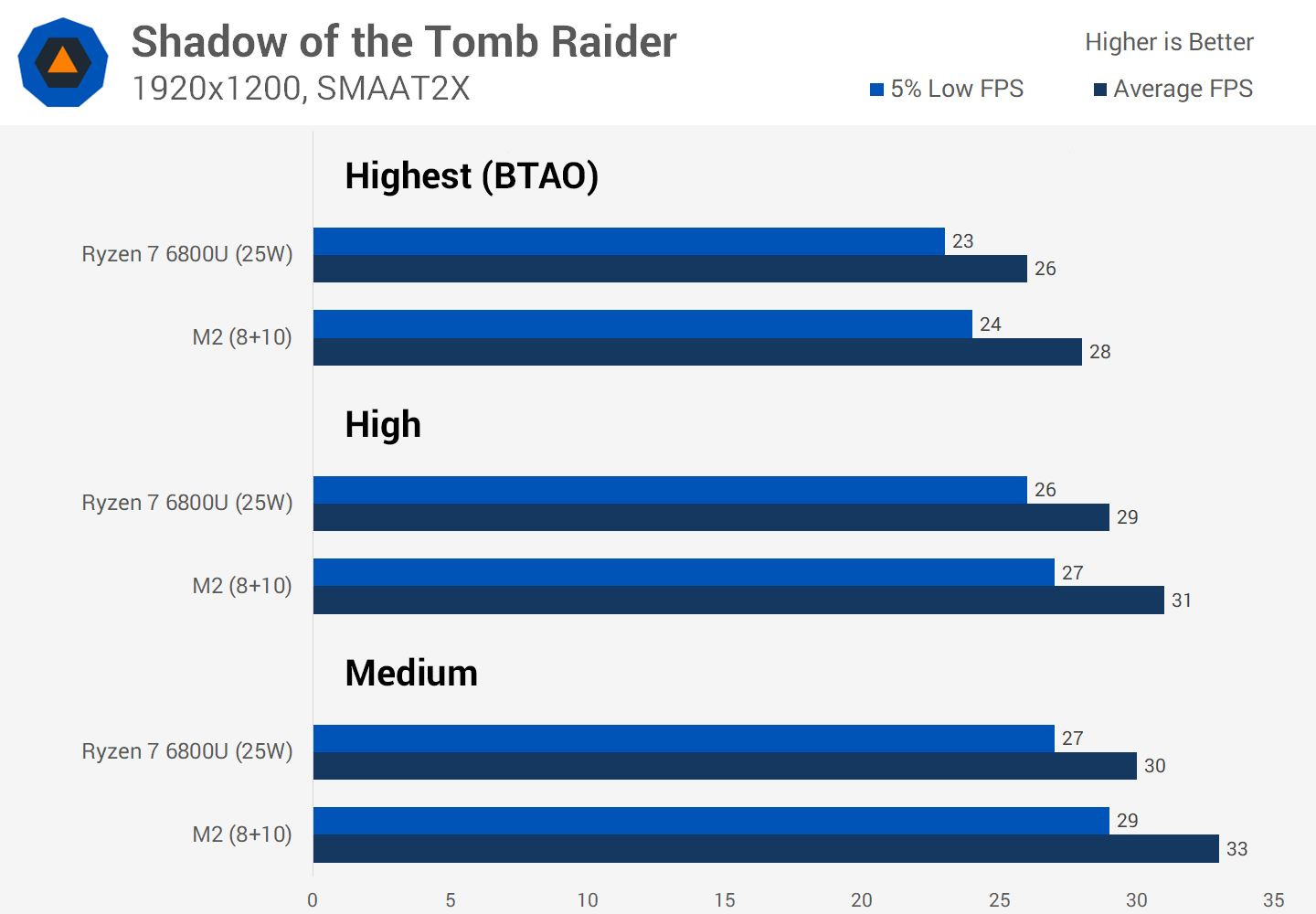 Using identical quality settings, the M2 is slightly faster for playing this game than the Ryzen 7 6800U when both are running at a similar level of power consumption. Looking at average frame rates, the M2 is 8 to 10 percent faster, which is quite impressive given how powerful the RDNA2 graphics is inside the 6800U.
