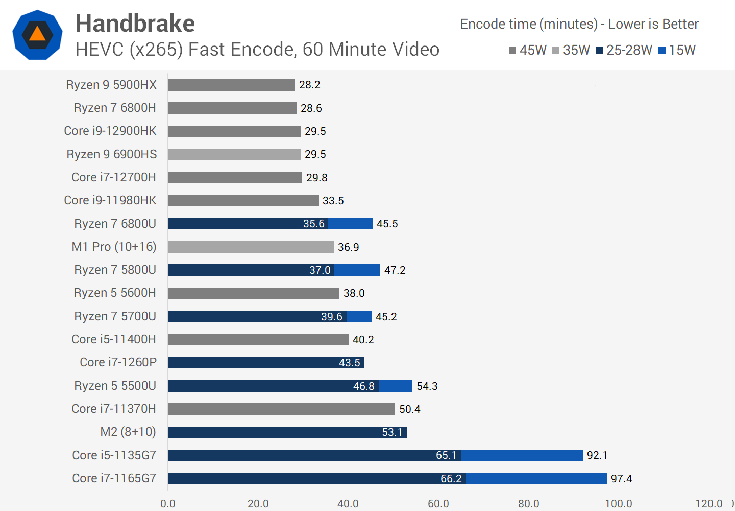 The M2 is not great at CPU-based video encoding in Handbrake. This is a heavy multi-threaded task that utilizes AVX instructions on x86 processors, which appears to give them an advantage over Apple’s Arm. The Ryzen 7 6800U in its 15W configuration is 17 percent faster despite using less power, and several other parts are also superior, including Intel’s 1260P.