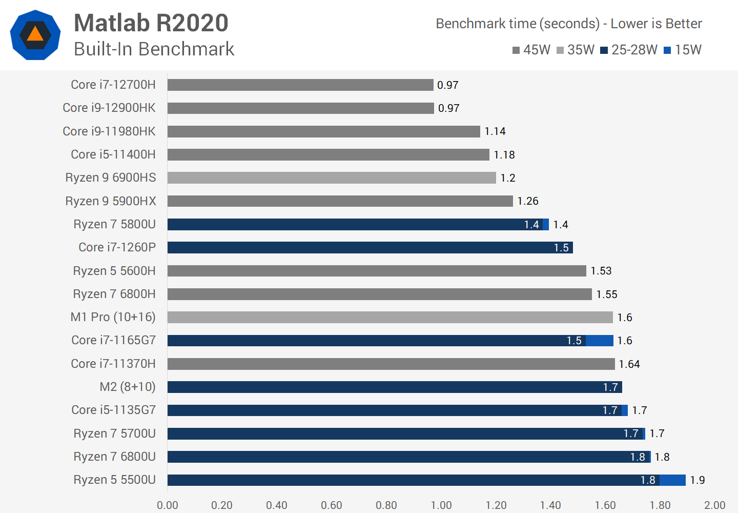 In Matlab the M2 performs similarly to the M1 Pro using the built-in benchmark. This is one of the last remaining apps that doesn’t have a native Apple Silicon version, so emulation is required and that hurts performance. The Core i7-1260P ends up 12 percent faster, which is not at all terrible with emulation but we suspect it could be better were this app native.