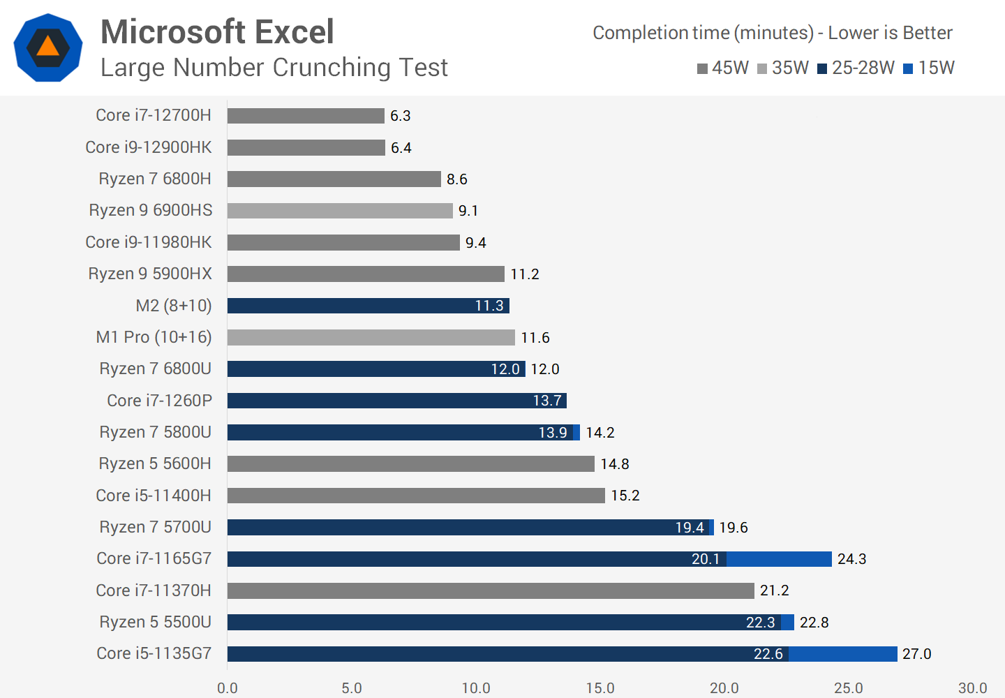 In our Microsoft Excel benchmark the M2 is fast, slightly outperforming the M1 Pro in what is a good test of the CPU’s cache capacity and performance. The M2 is 6 percent faster than the Ryzen 7 6800U and 21 percent ahead of the Core i7-1260P, placing in in the lead among ultraportable class processors that we’ve tested.