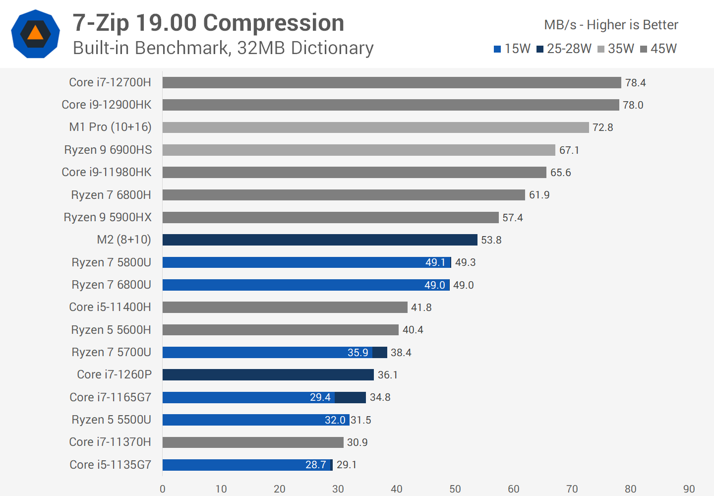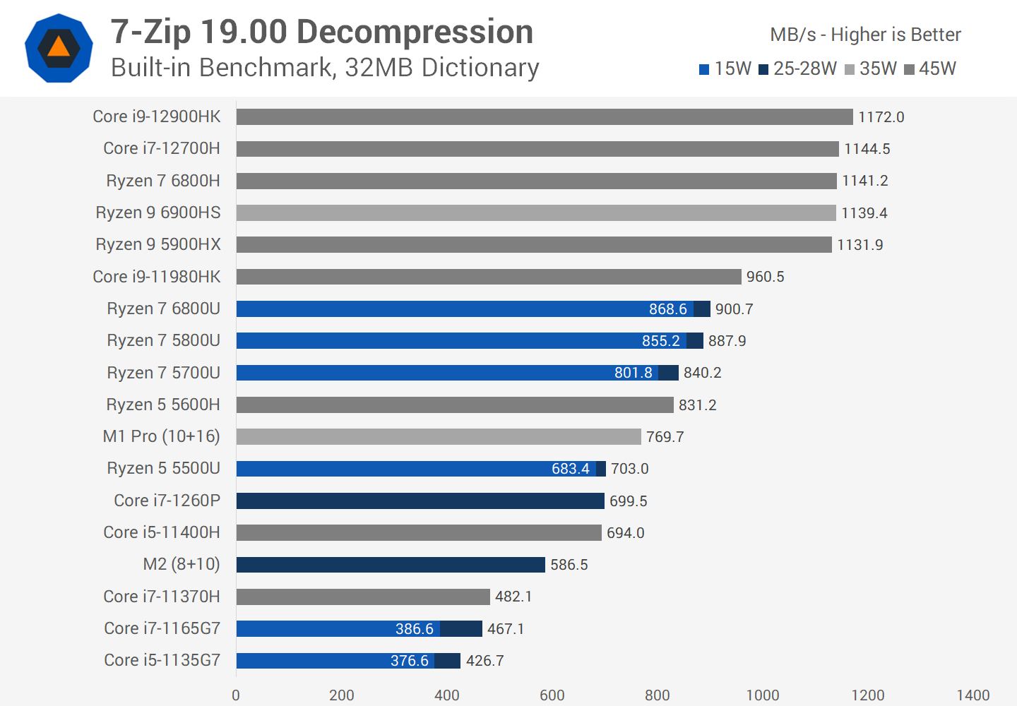 However for decompression the story is inverted, now it’s the M2 that is the least impressive part of the current generation models. The 6800U is a real beast in this workload, delivering 53 percent more performance in its 25W configuration. The 1260P is also 19 percent faster, though this looks less impressive given the 1260P uses more power than the M2. The AMD CPU does as well, but at least you get a big improvement in performance there.