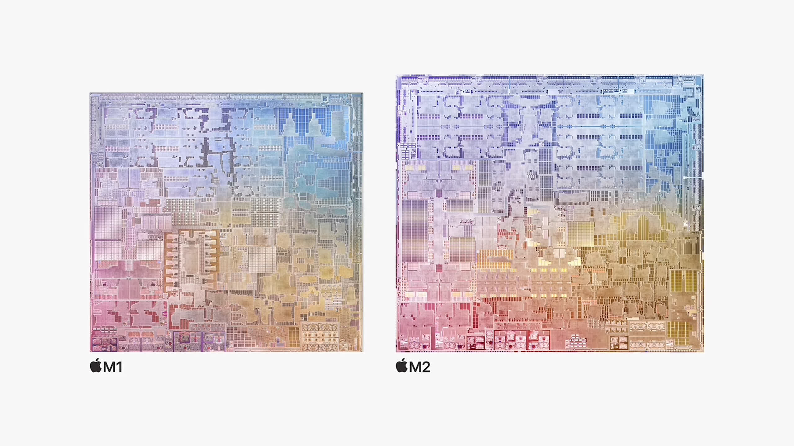 This is the same 4+4 configuration as the M1, but with updated cores, and it contrasts to the M1 Pro and M1 Max which use more performance cores, but fewer efficient cores. That’s because those chips are designed for high performance productivity systems, while the M2 is destined for ultraportable machines. The performance cores are clocked up to 3.5 GHz, slightly higher than its predecessor.