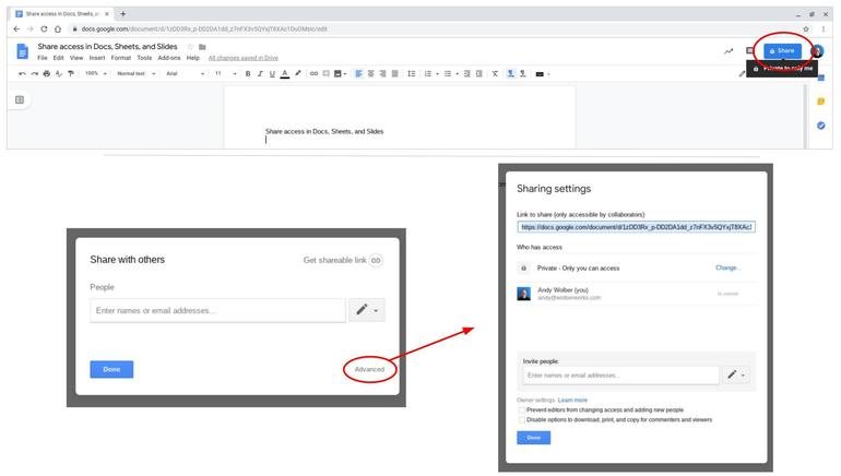 The two main ways to share a G Suite file are either to add an email address or get a link; these methods are subtly different. When you add an email address, the person associated with that address gains access to your file. When you enable sharing with a link, access may be shared more broadly, if you choose-and if allowed by your organization’s settings.