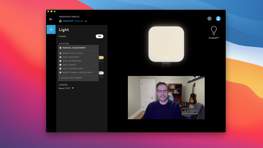 G Hub is the app used for Logitech’s G gaming keyboards, mice, speakers, headsets and webcams. Plug in the Litra Glow and G Hub will recognize and add it to your list of devices. Select it and you can manually change brightness and color temps with sliders. If you have one or multiple cameras connected to your computer, the app has a drop-down menu to select and preview the picture from each camera.