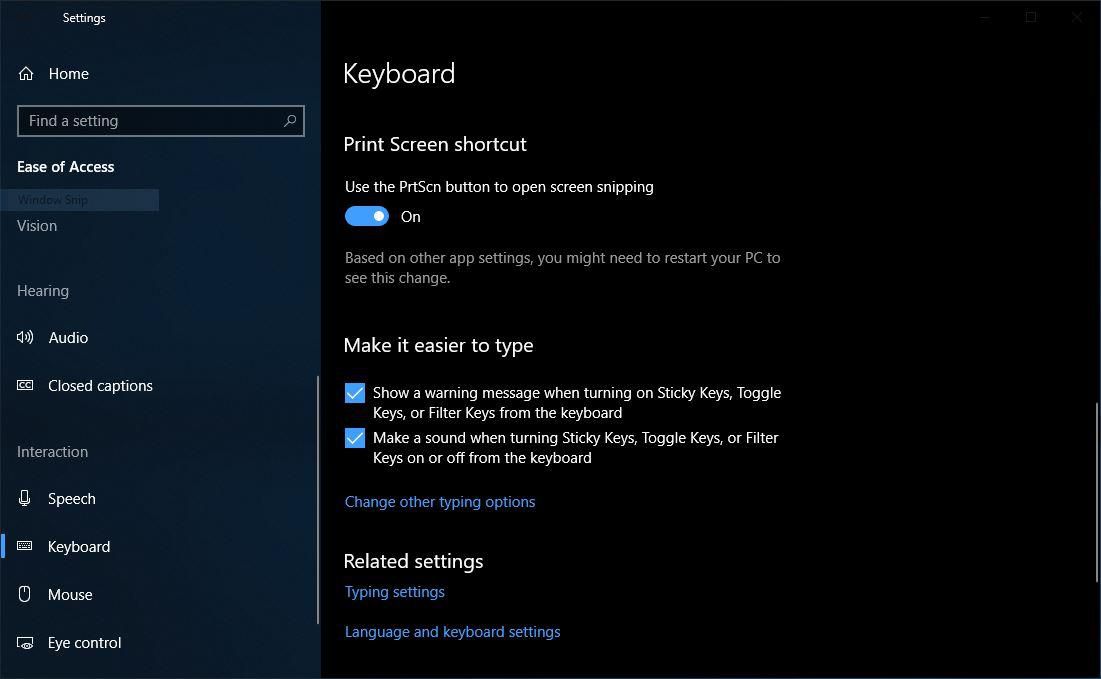You can also set the PrtScn button to open the Snip & Sketch tool by going to Settings > Ease of Access > Keyboard and toggling on Use the PrtScn button to open screen snipping under Print Screen Shortcut.